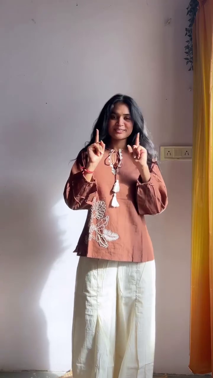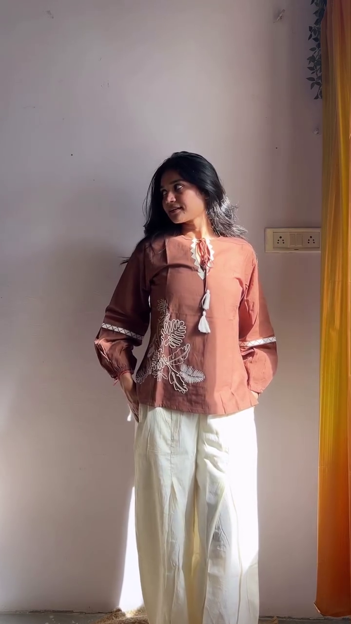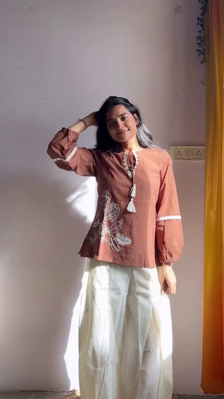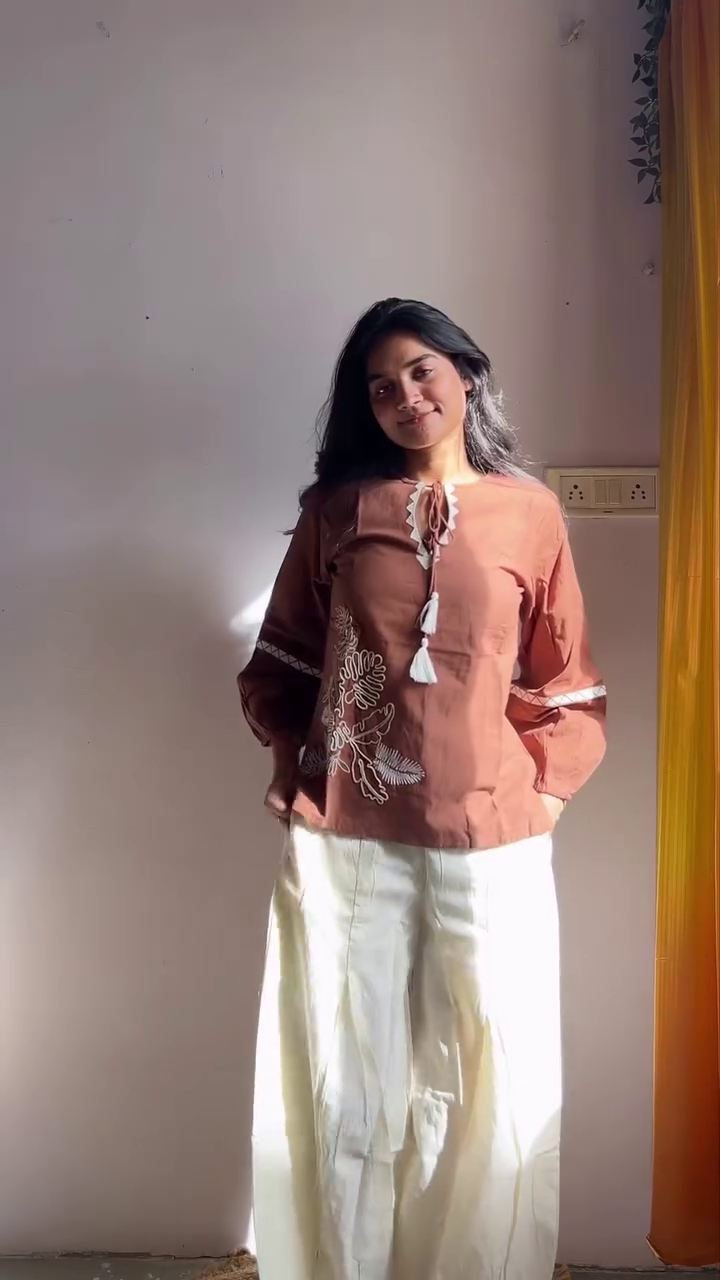 🌺 Step intoΒ bohemian paradiseΒ with this stunning terracotta kurta set that blendsΒ Indo-Western flairΒ andΒ casual sophistication! 🌟 Crafted fromΒ breathable cotton, the kurta boastsΒ delicate white thread leaf embroideryΒ cascading across the peplum hem,Β puffed three-quarter sleevesΒ with lace trim,Β tassel tie-up V-neck, andΒ flattering A-line silhouetteΒ that sways beautifully. πŸ’ƒ Paired withΒ crisp white wide-leg palazzo pantsΒ for that perfectΒ flowy ethnic vibe – just like the radiant model glowing in your image! 😍 Perfect for brunches, temple visits, casual outings, workwear, or Surat’s sunny afternoons! β˜€οΈ