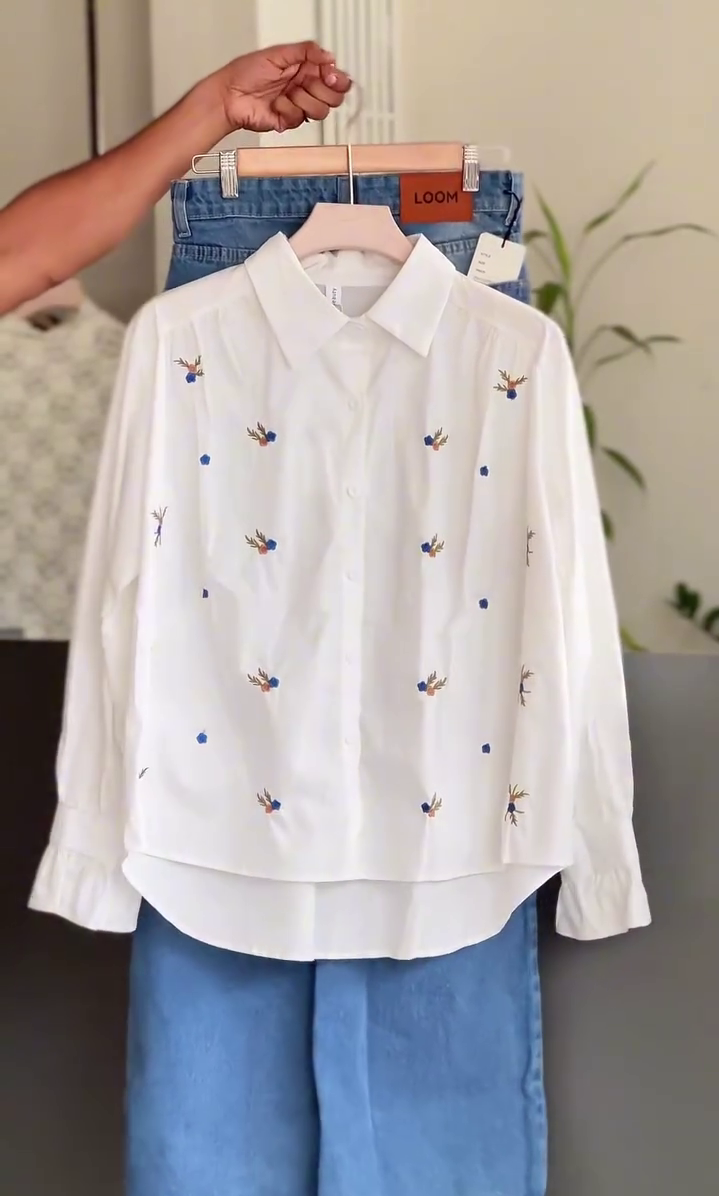 Hand-stitched birdsย add personality whileย white baseย keeps it versatile.ย Wide-leg jeansย elongate legs with breezy flow! Style shirt withย pearl necklaces,ย gold hoops,ย woven belts,ย espadrilles,ย sneakers, orย loafers. Jeans pair withย crop tops,ย tees,ย blazersย for endless outfits. Accessorize withย sunglasses,ย mini bags,ย scarvesย for complete spring perfection! ๐ Theย white-blue-coral paletteย flatters every complexion beautifully!