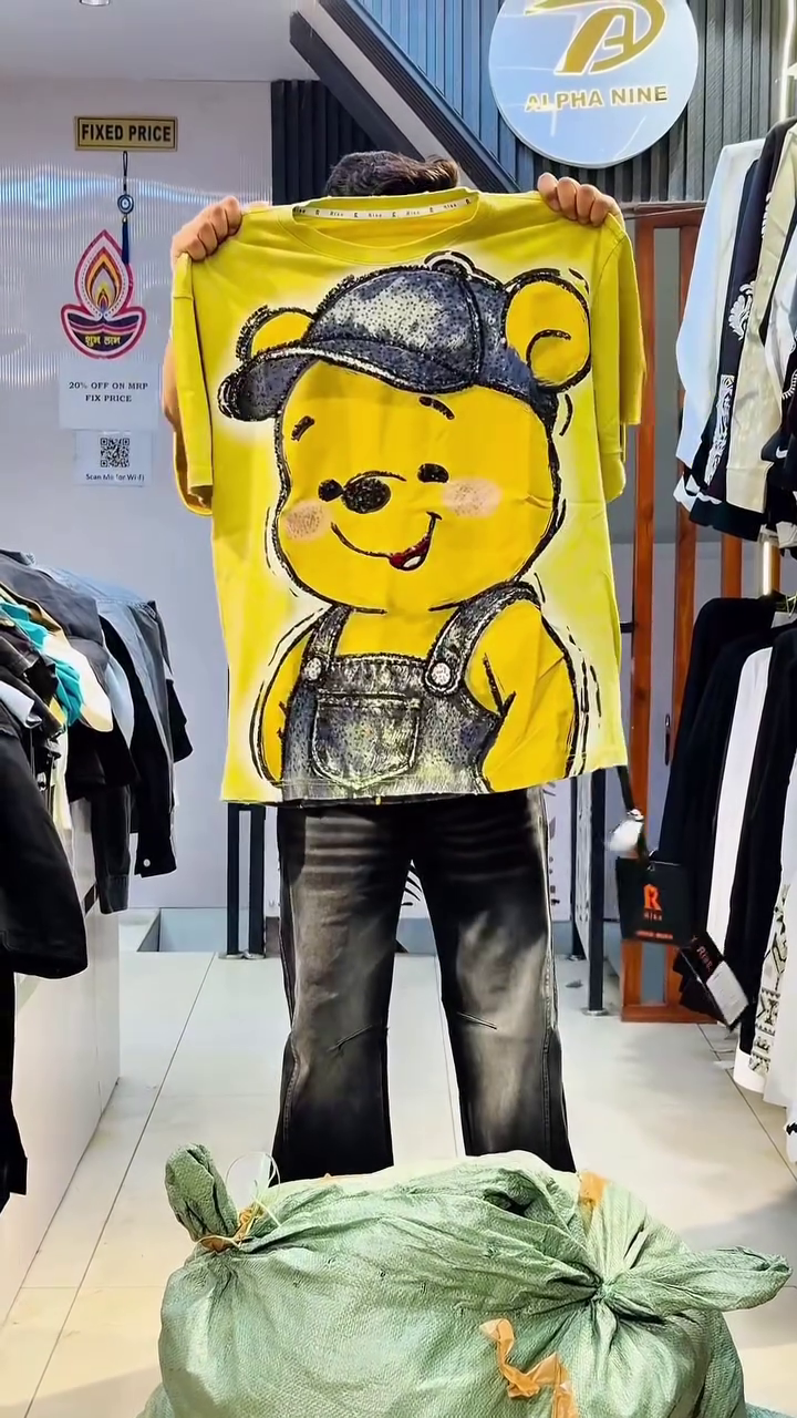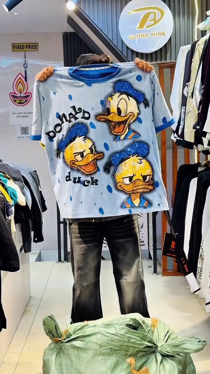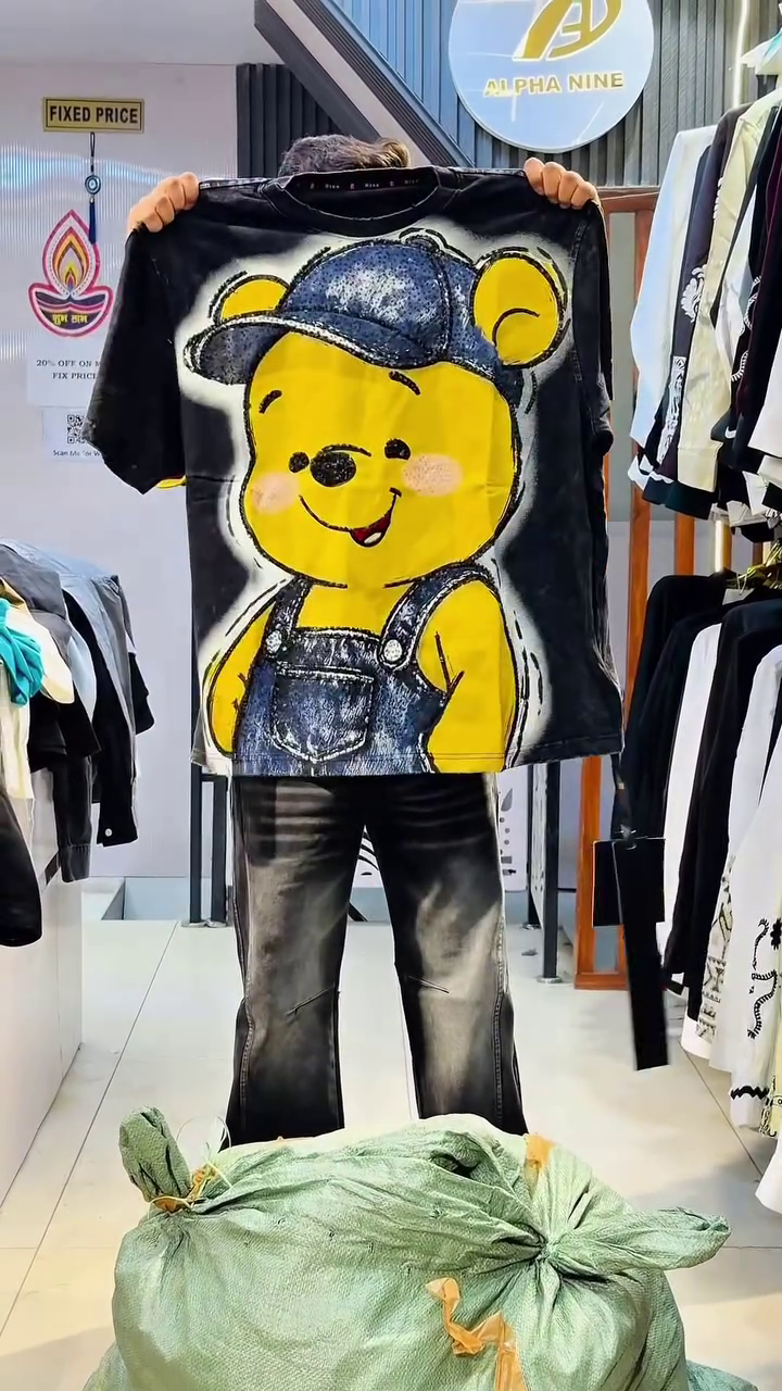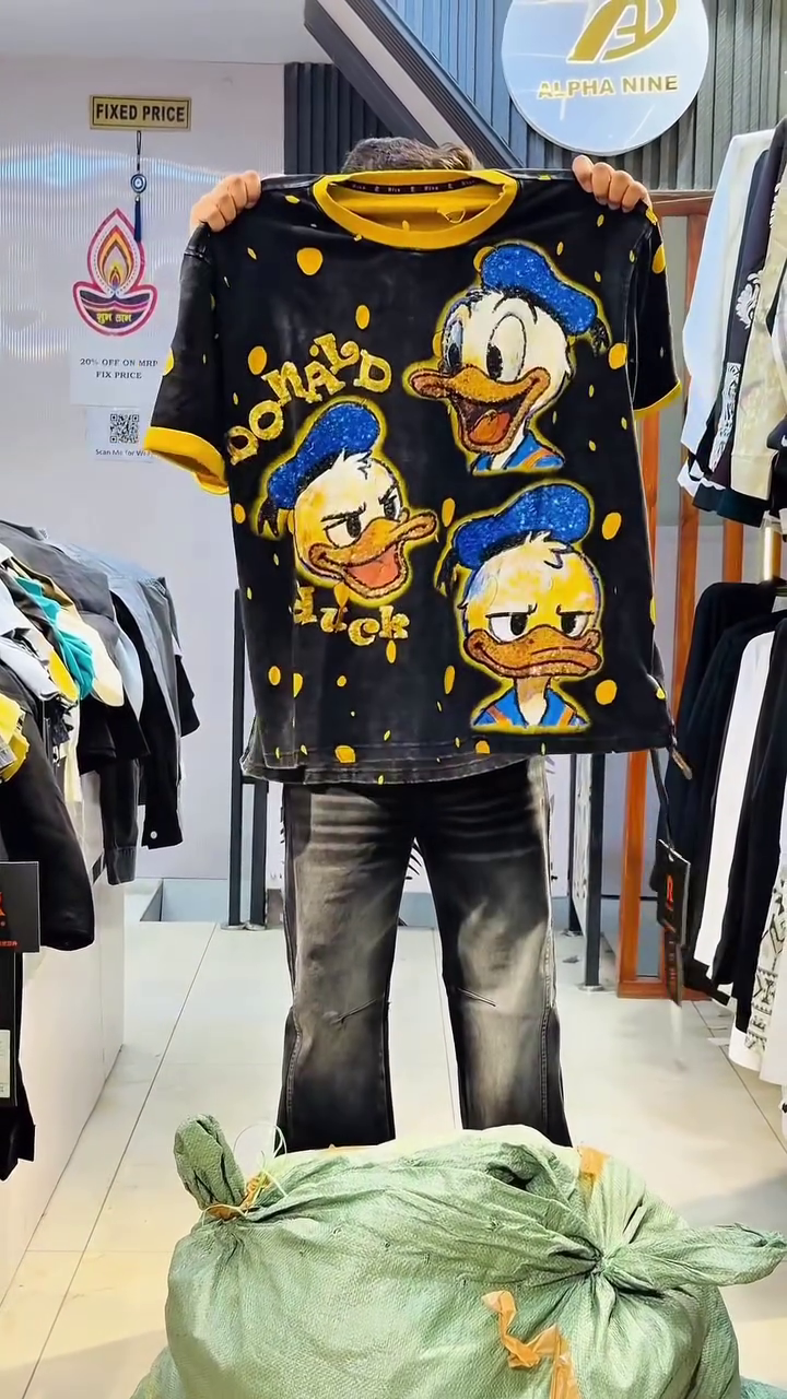Unleash cartoon chaos with this wild EUA x Alpha Nine Mickey Mouse jacket that’s pure Disney streetwear anarchy! 🌟 Crafted from premium black cotton base with layered distressed denim fringe, it explodes with massive Mickey Mouse face grinning mischievously, “EUA Brand in MFA” slogans, “POWER” graffiti in yellow-pink-blue gradients, white Adidas-style stripes, and ragged fringe edges creating maximum texture. The oversized fit, dropped shoulders, and perfect hem crop make it ideal for festival stage domination, perfectly showcased hanging in your trendy boutique with “Fixed Price” signage! 😎