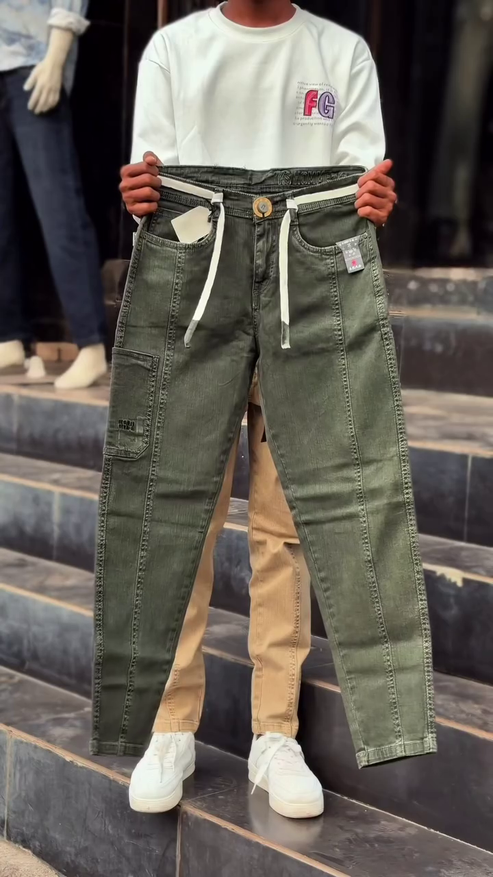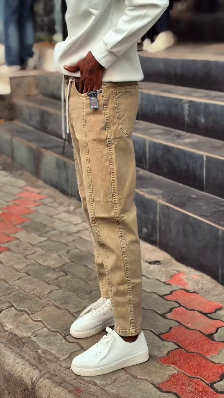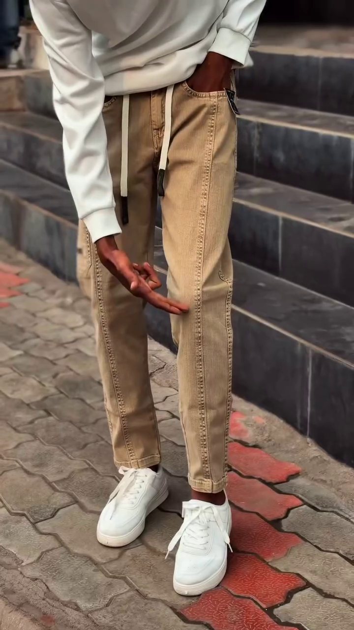 Step into subtle swagger with these beige jogger-style jeans, stitched with precision and styled for movement 🌬️👖. The drawstring waist and visible seams add texture and edge, while the relaxed fit invites comfort and confidence 🧘‍♂️🛹. Paired with a crisp white sweatshirt and white sneakers, this look is a masterclass in neutral layering 🤍👟.