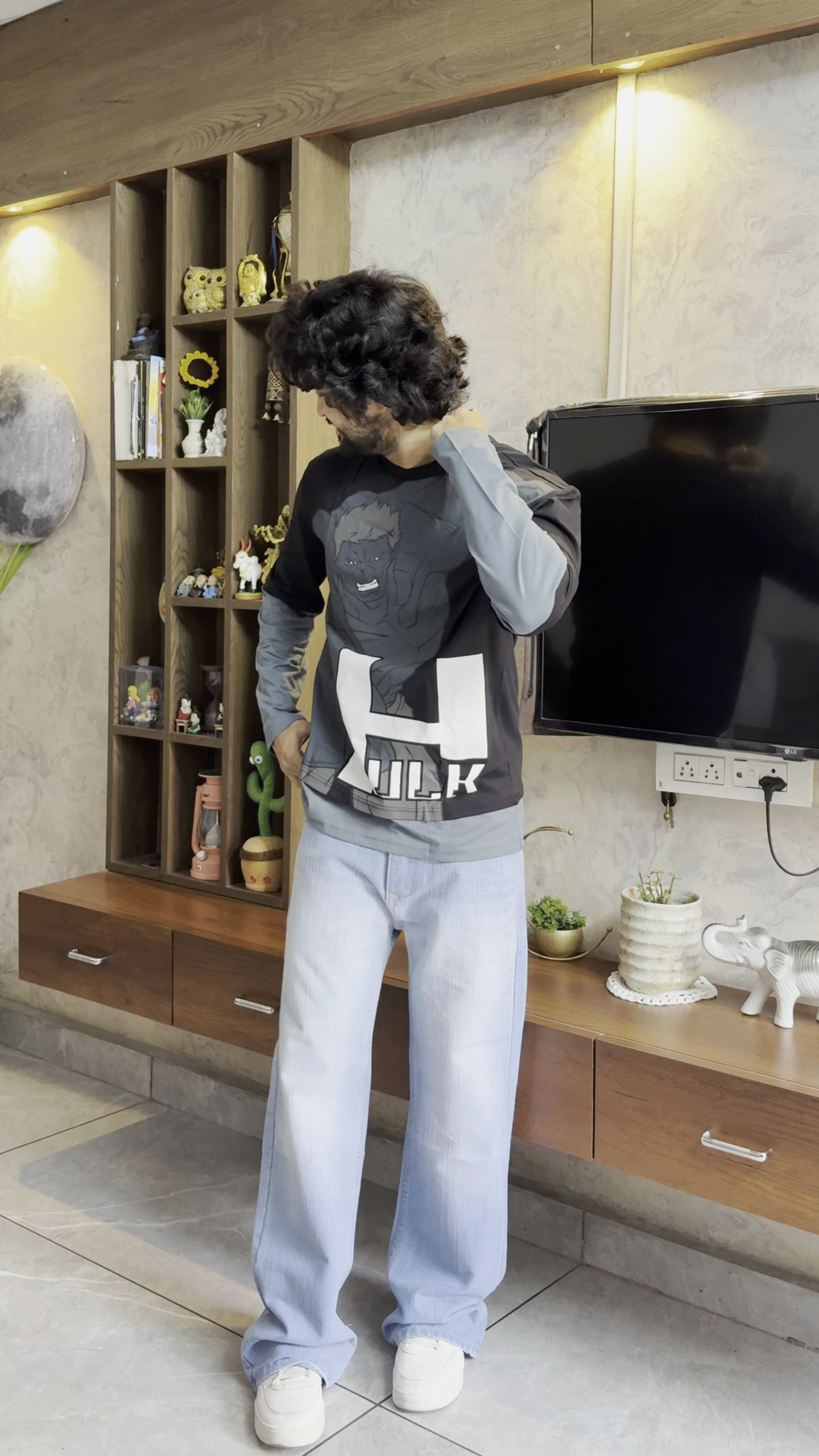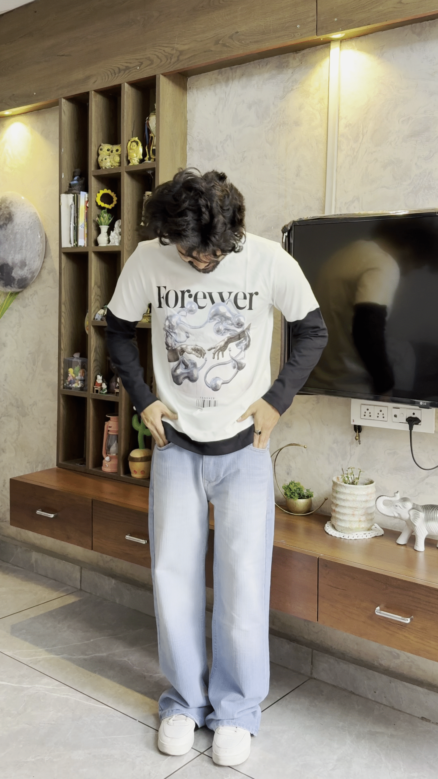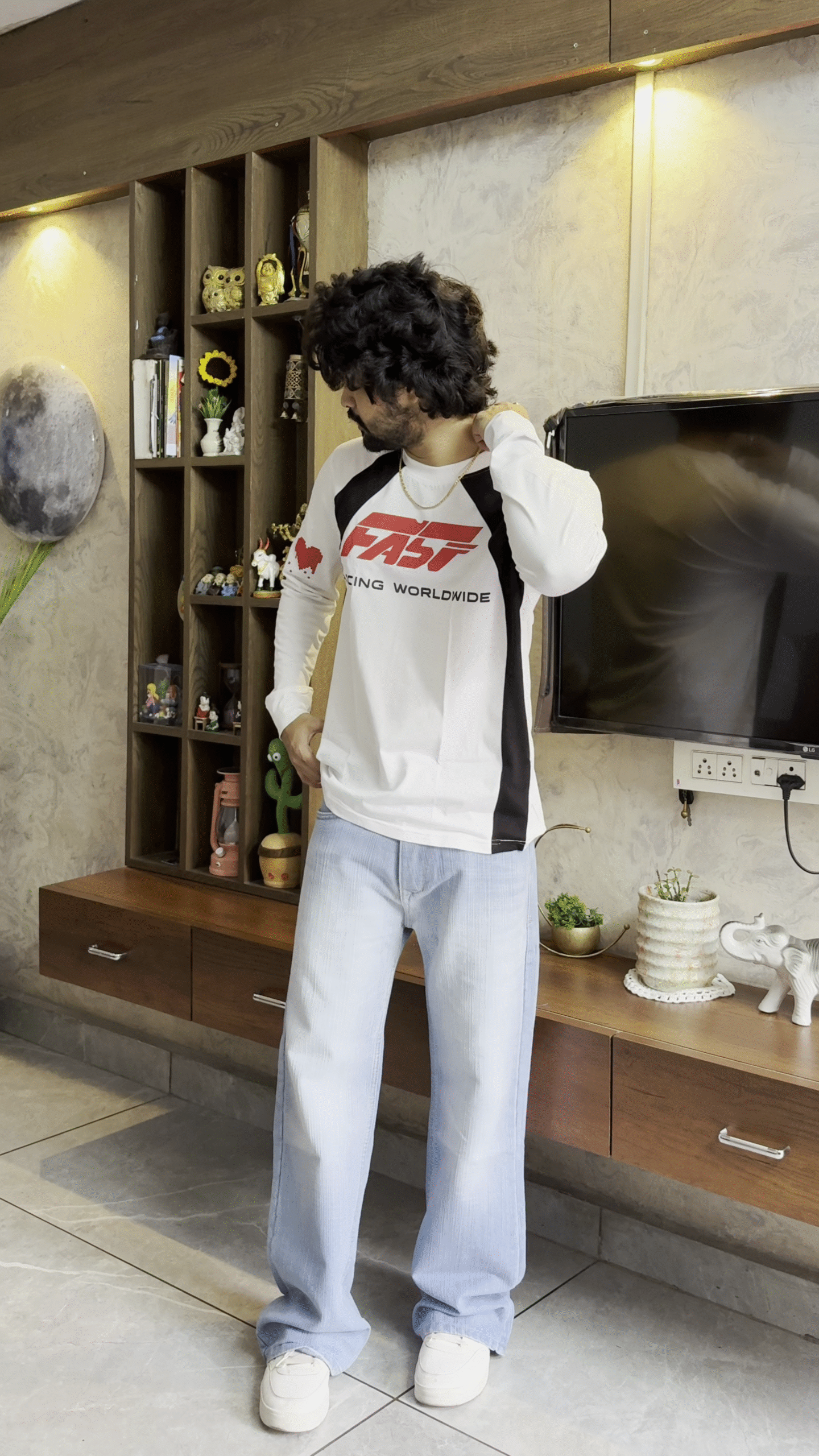 The shirt features a clean white base with bold black side panels, creating a sleek athletic silhouette that visually enhances body shape. The graphic design on the chest adds a dynamic streetwear vibe and makes the outfit stand out in a trendy way .