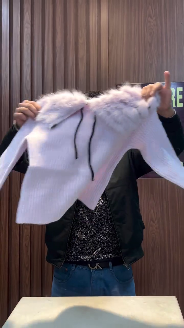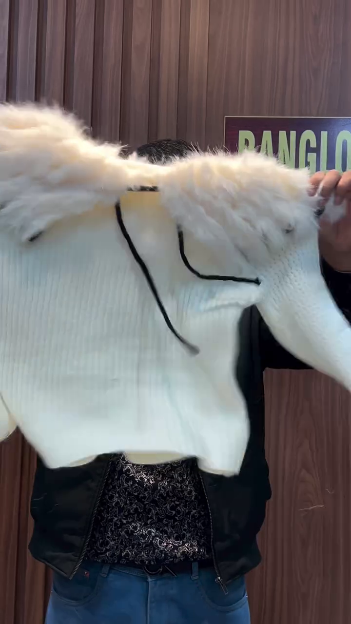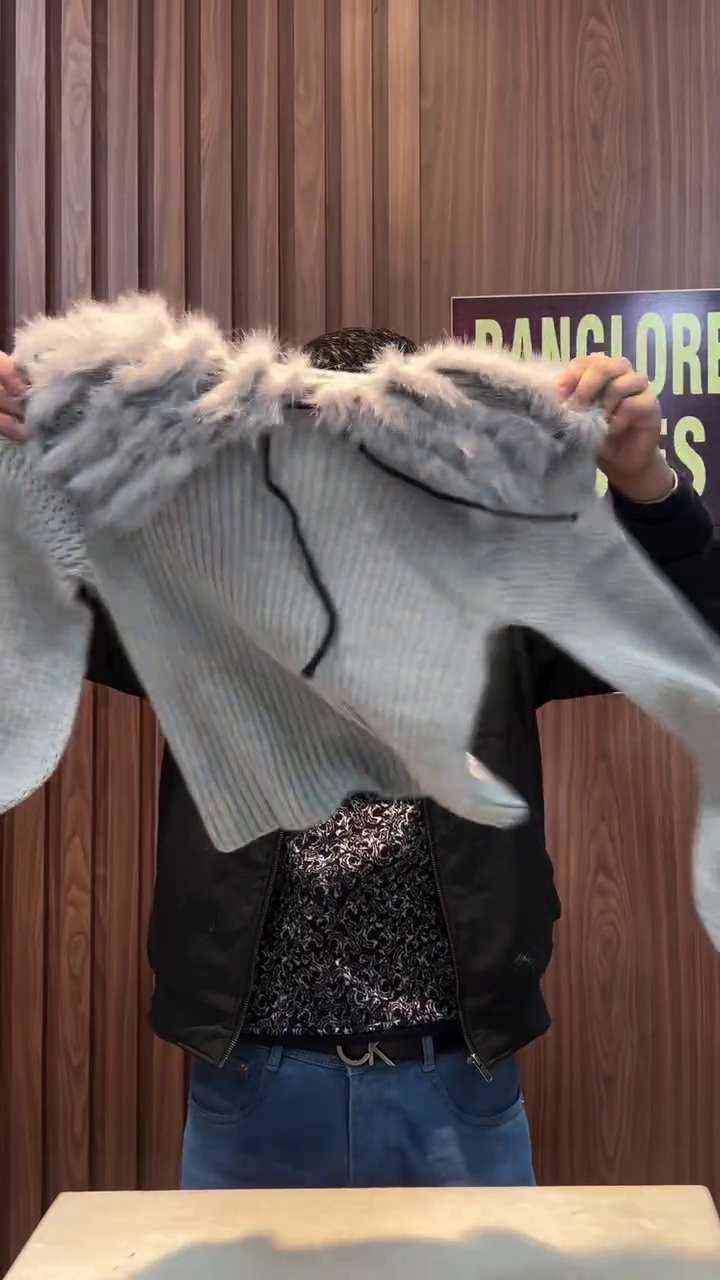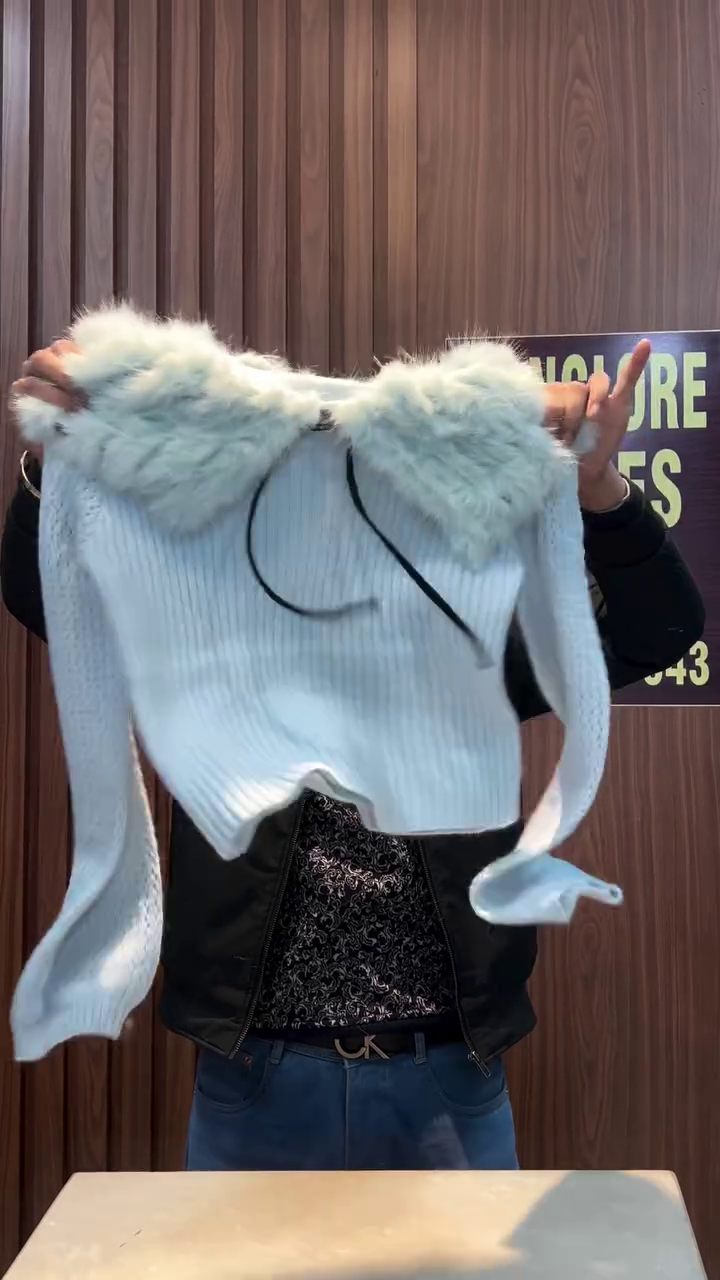 The Cocoa Whirl sweater is a cozy embrace in cropped form 🤗. With ribbed texture that dances in light 🧵✨ and a plush furry collar that whispers warmth 🐻❄️, this piece is perfect for layering over denim, skirts, or even sarees for a fusion twist 👖👗. Held up proudly in a rustic setting of wood paneling 🌲 and casual charm, it invites you to feel the season in every thread. Available in ALL sizes—because comfort and style should wrap around every body like a hug 🤎🌈.