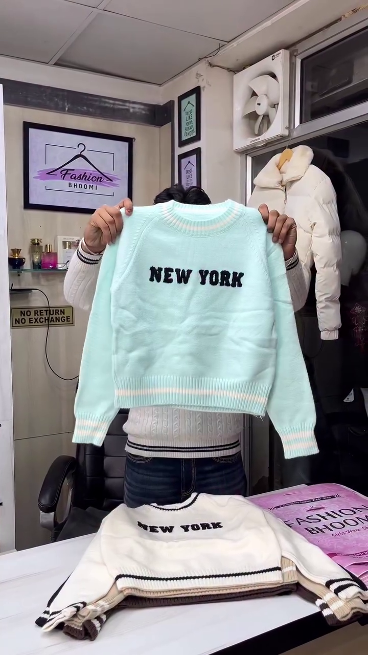 This cream knit sweater 🤍 is cozy, trendy, and perfect for everyday winter styling. Featuring a round neck with contrast black tipping, it gives a sporty yet casual vibe. The front showcases bold city‑inspired lettering in textured knit for a fun streetwear look 🖤. Sleeves and hem have matching striped rib cuffs that keep warmth in and give a snug fit. The soft knit fabric feels comfortable against the skin and is ideal for layering over shirts or under jackets. Pair it with jeans, joggers, or skirts for college, shopping days, and casual hangouts. It’s easy to style in multiple ways—tuck it slightly at the front for a relaxed, fashionable silhouette, or wear it loose for maximum comfort. Great for travel and daily winter wear. ❄️