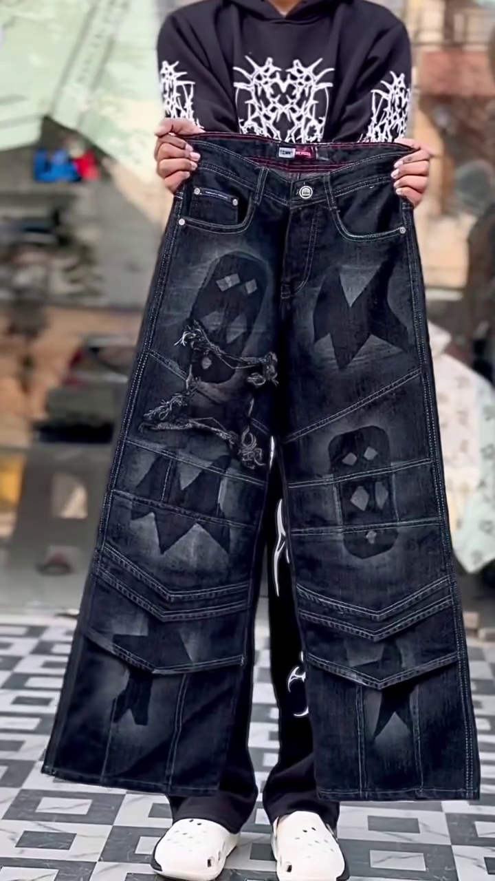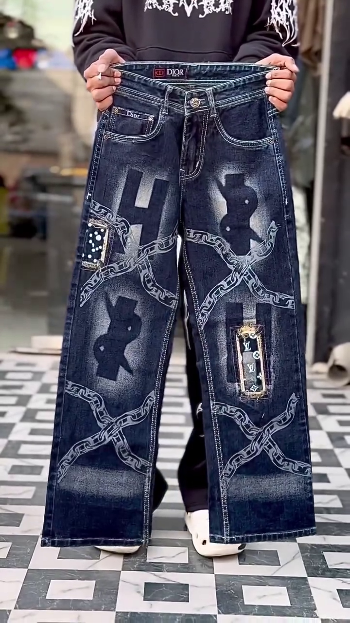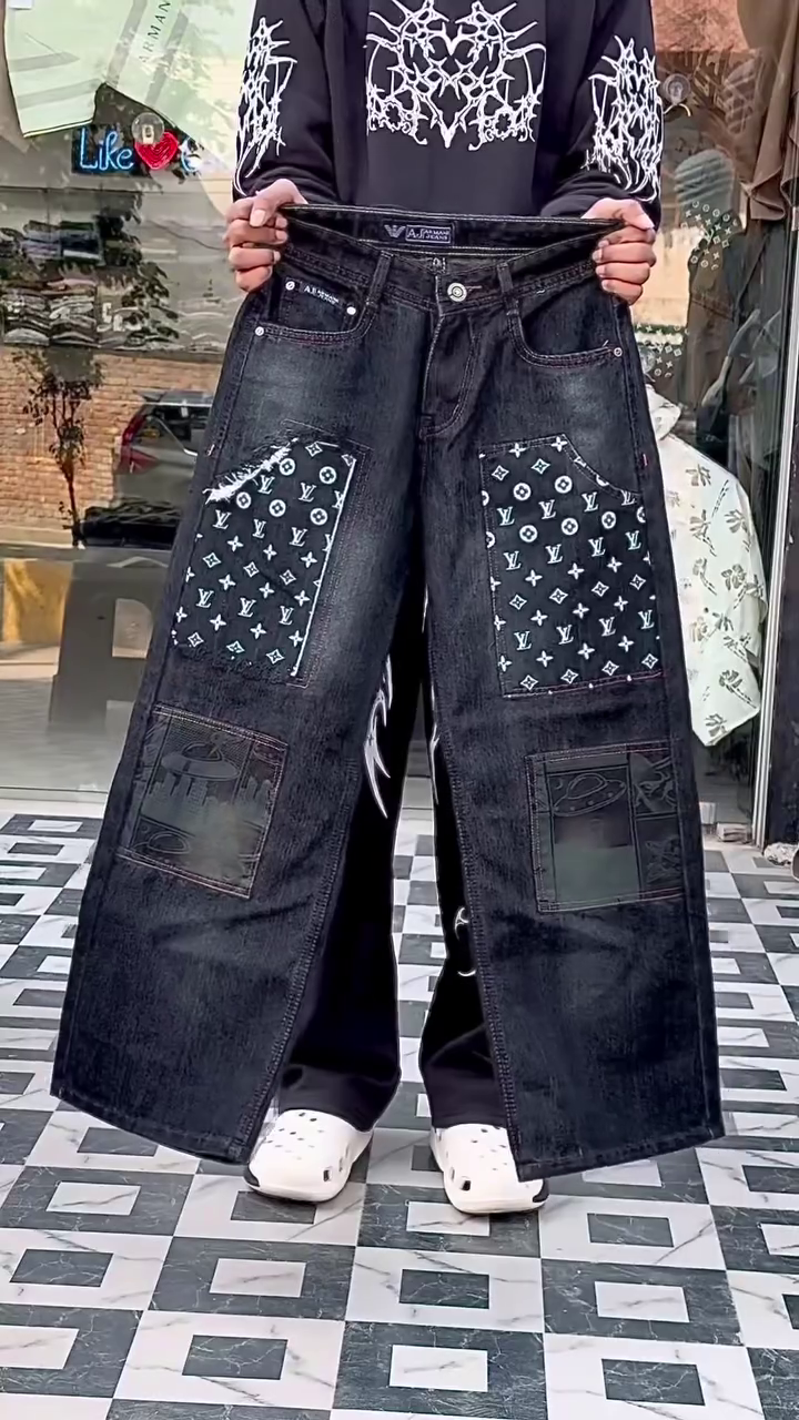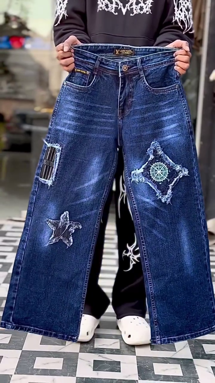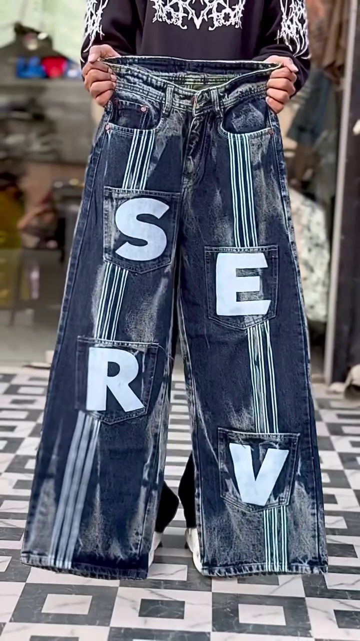 These bold dark-wash wide-leg denim jeans feature striking vertical stripe panel detailing 💙 along with oversized alphabet patch pockets stitched across the front for a strong streetwear statement 🔥. The high-rise waist and relaxed wide-leg cut provide both comfort and edgy appeal.