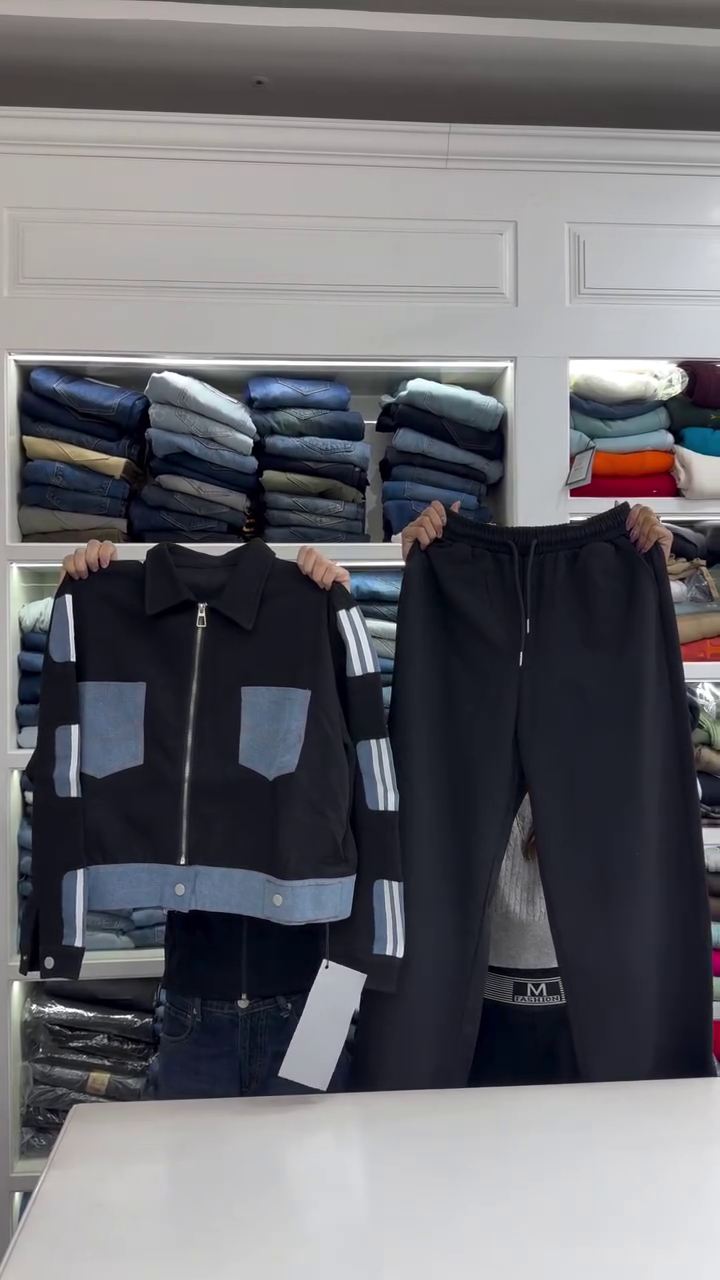 The Denim Pulse duo is a bold remix of streetwear and structure 🎶🧥. A beige-and-denim jacket with black sleeve stripes 🖤 and zip-up front 🔁 meets oversized frayed denim pants with side panels and drawstring ease 🎨👖. It’s a look made for movement, mood, and mirror moments 📸🌆.