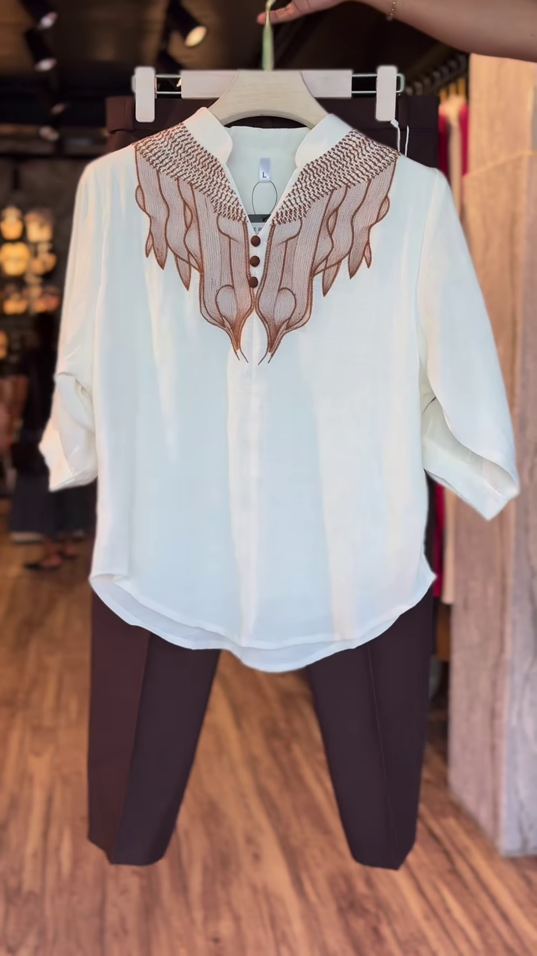 Minimal yet impactful, the Earth & Edge Set is for the ones who like their style with depth and detail. The ivory high-low shirt features a dramatic brown embroidered neckline resembling cascading feathers or flames – a statement in itself. Paired with sharply tailored coffee brown pants, it’s a sophisticated pick for work or dinner plans.