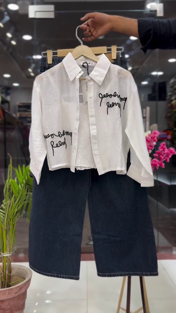 Step into effortless style with this ultra-trendy co-ord set that blends minimal elegance with bold street vibes ππ₯. Featuring a crisp white shirt layered over a soft inner top and paired with relaxed wide-leg denim pants, this outfit is designed for those who love comfort without compromising on fashion π―π«. The standout element? The artistic scribble-style text print βοΈπ€ that adds a unique, modern personality to the entire lookβperfect for making a subtle yet stylish statement.