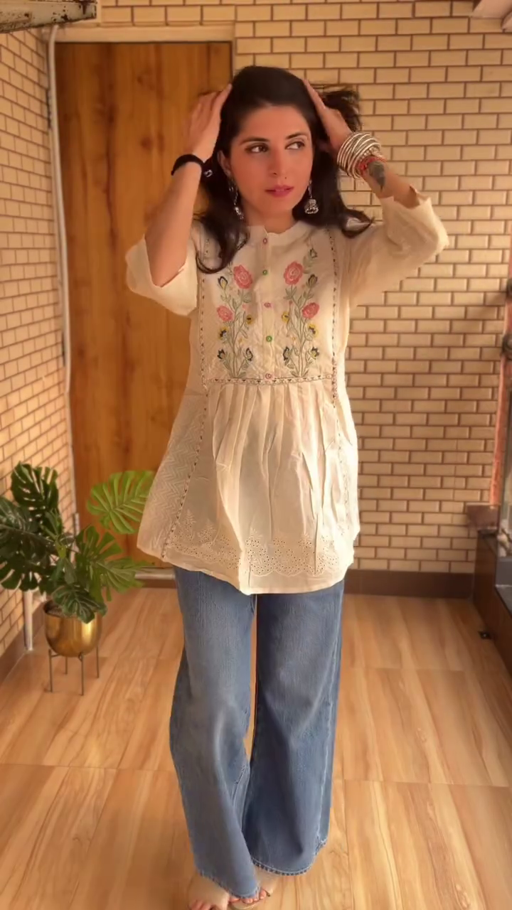 This cream embroidered peplum style top blends artistic craftsmanship with modern bohemian fashion. The top features delicate floral embroidery across the chest panel, adding a handcrafted aesthetic that gives the garment a unique and elegant look.