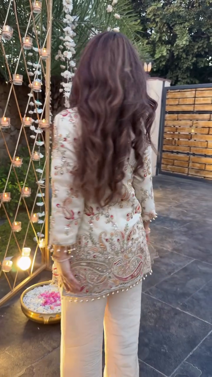 This graceful ivory embroidered suit includes paisley motifs, bead accents and soft golden detailing 🤍✨.
