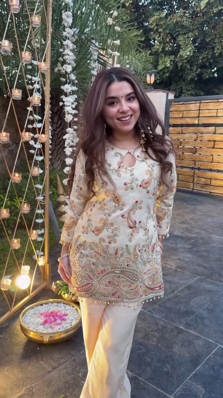 The kurti has a stylish keyhole neckline and pairs beautifully with straight palazzo pants. It gives a classy, minimal yet festive vibe.