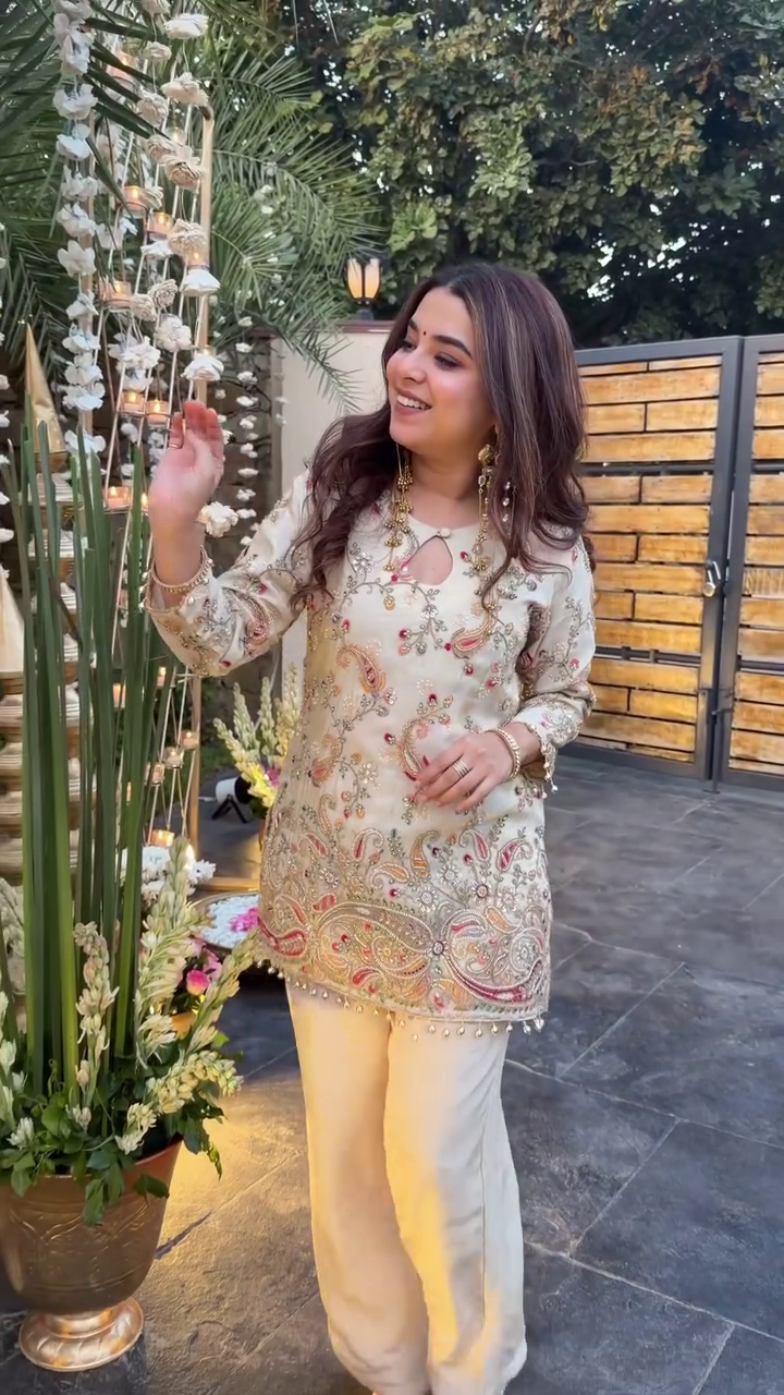 Be the first to review “Ivory & Gold Embroidered Straight Kurti with Palazzo Pants 🤍💛✨”