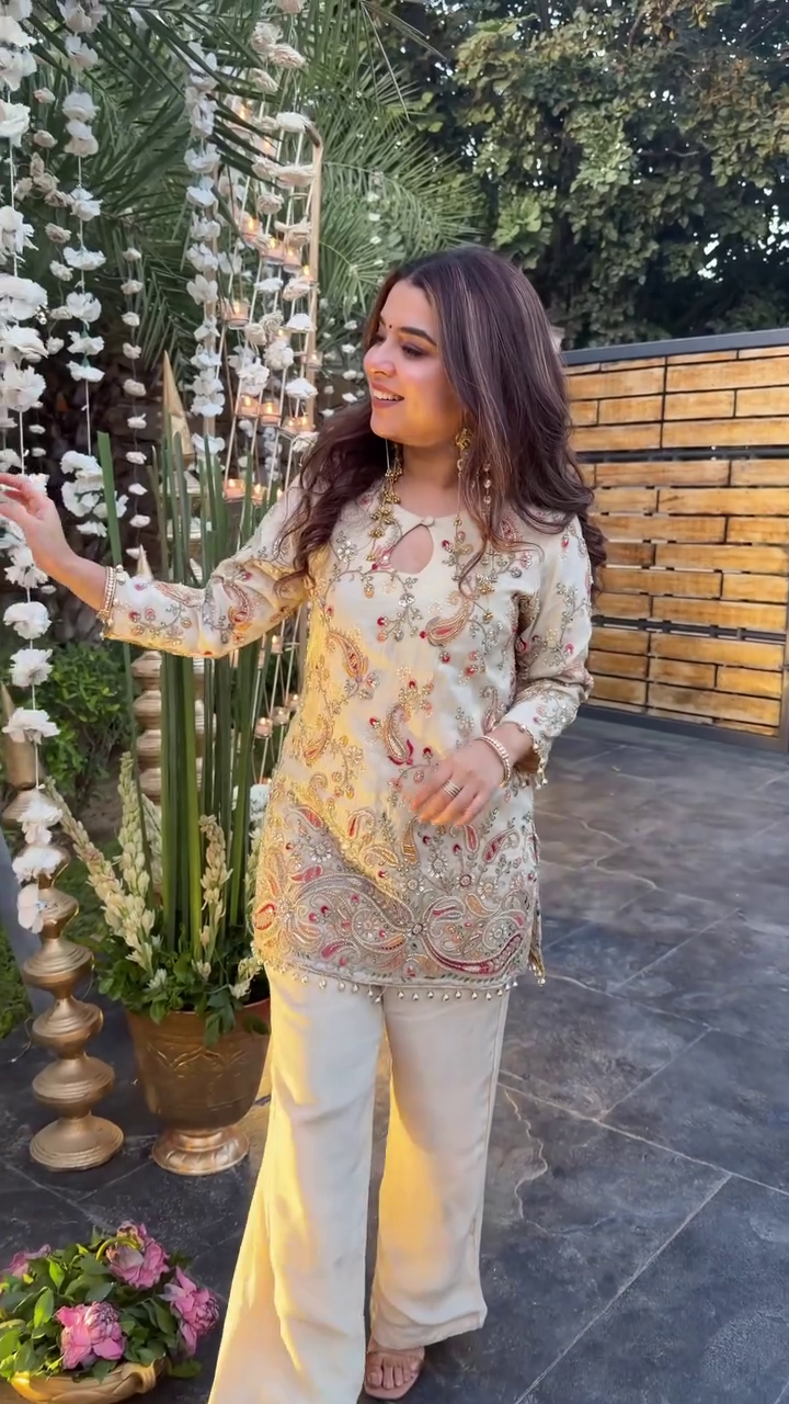 Ivory & Gold Embroidered Straight Kurti with Palazzo Pants 🤍💛✨