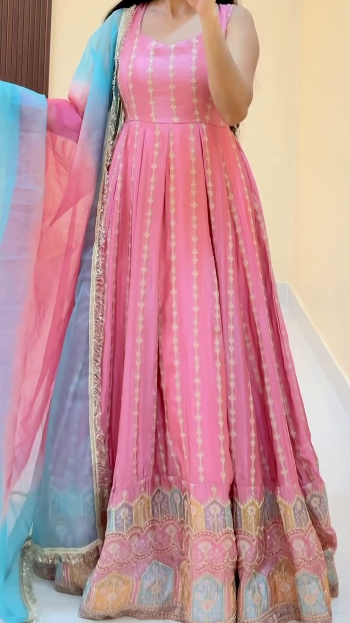 Step into a world of soft elegance with this breathtaking Pastel Dream Weave Flared Anarkali Set in shades of baby pink and sky blue 🌸💗💙. The beautifully crafted Anarkali features delicate vertical woven patterns that elongate the silhouette and add a graceful shimmer with every movement ✨🌟.