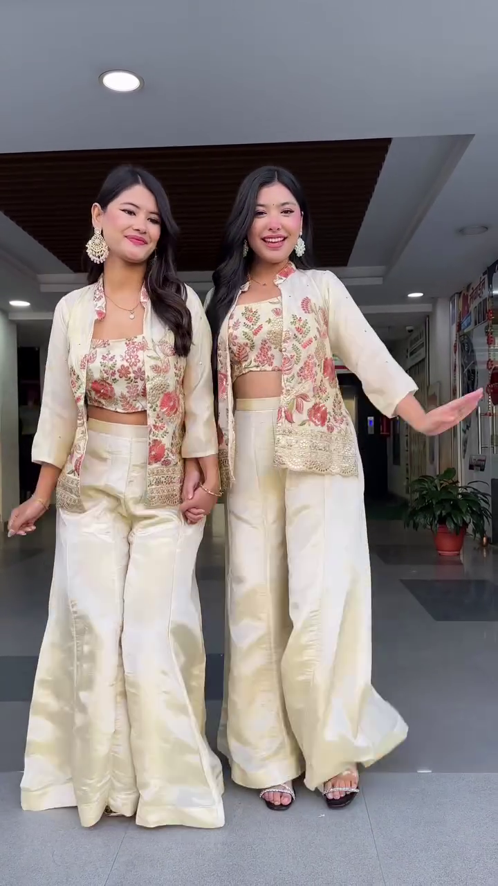 Paired with wide-flared shararas made from a flowy, glossy fabric, the outfit creates a dreamy silhouette with every step, swirl, and twirl πŸŒˆπŸ’ƒ. The sharara falls elegantly, adding movement and charm while staying incredibly lightweight and breathable.