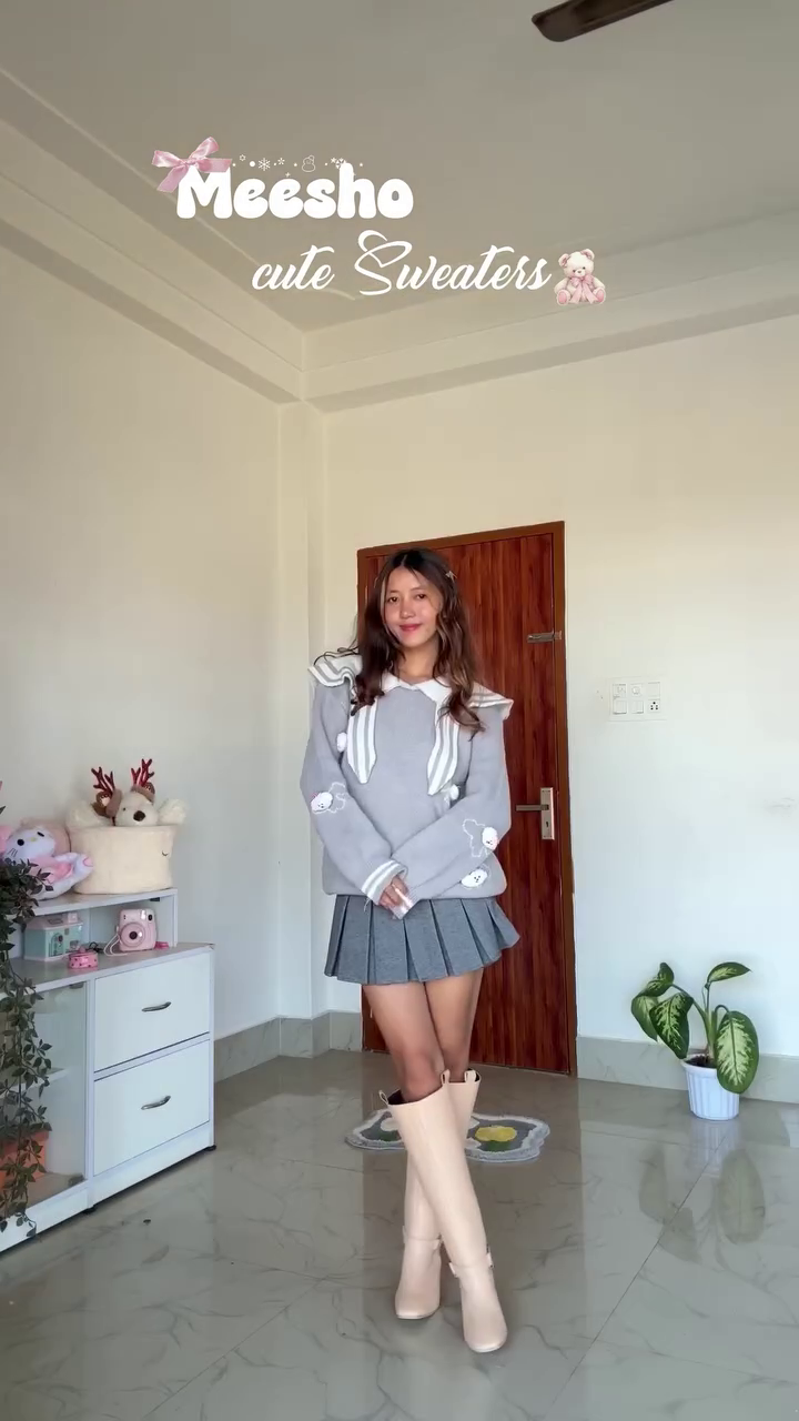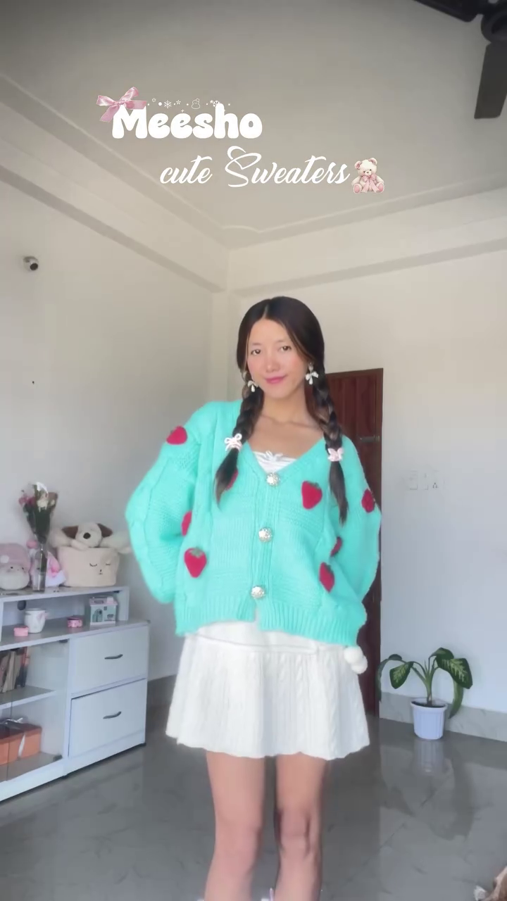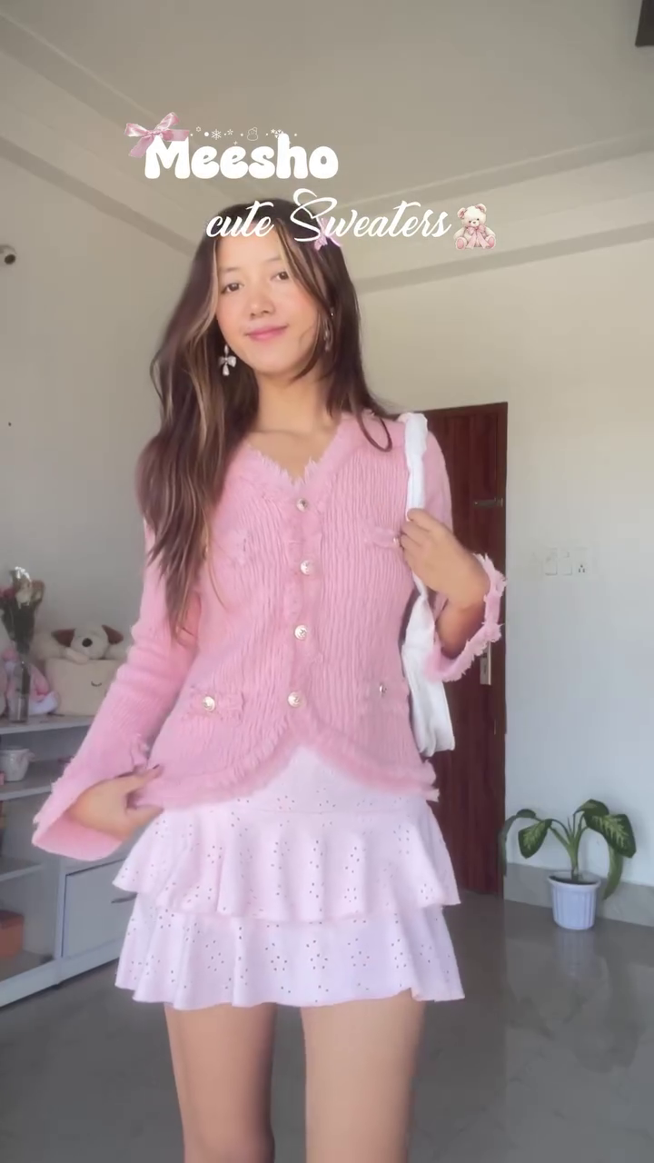 Step into a daydream of softness and sparkle with the Rosy Whimsy ensemble—a pastel fantasy stitched with sweetness and style 🌸🧶. The textured pink sweater, adorned with delicate decorative buttons 🎀✨, wraps you in cozy elegance while whispering tales of childhood charm and grown-up grace 🧸💫.