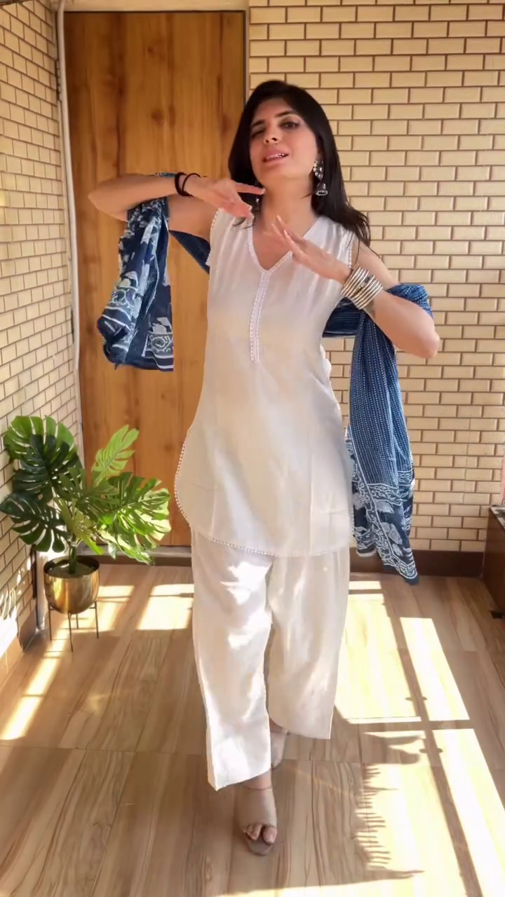 This elegant three-piece ethnic fusion outfit features a minimal ivory sleeveless kurta, comfortable matching straight pants, and a contrasting indigo printed dupatta that adds traditional character to the look.