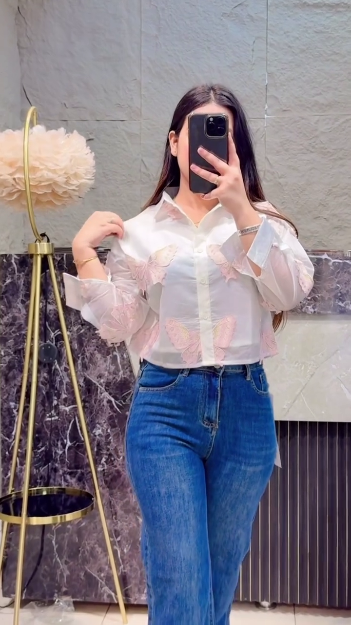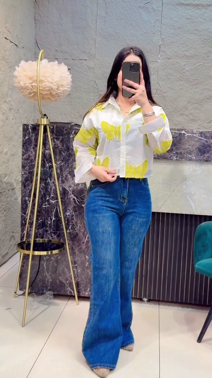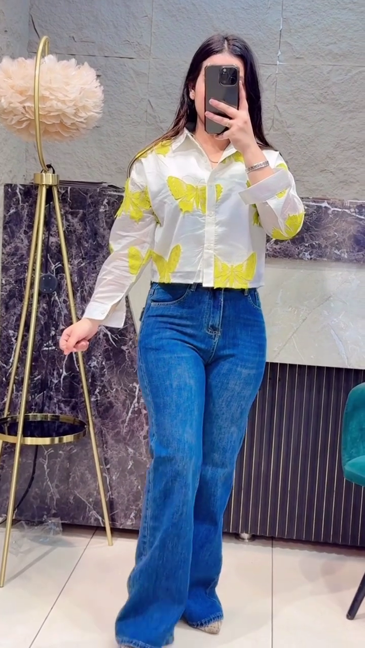 This stylish women’s fashion combo features a white butterfly printed cropped button-down shirt paired with high-waist flared blue denim jeans, creating a trendy modern street-style outfit that blends elegance with casual comfort.  The shirt features vibrant yellow butterfly prints on a soft white base which gives a refreshing aesthetic look perfect for everyday fashion, brunch outings, casual meetups, vacations, and social media photoshoots.